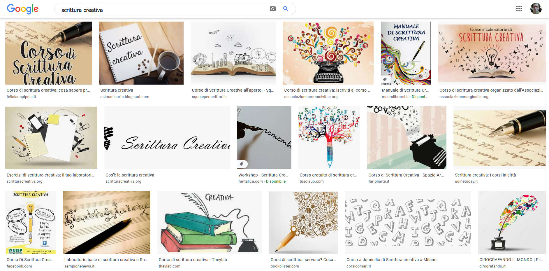 Ora, però: se faccio una ricerca per immagini in Google con le parole chiave “scrittura creativa” (tra virgolette, mi raccomando), i primi risultati che ottengo sono questi: